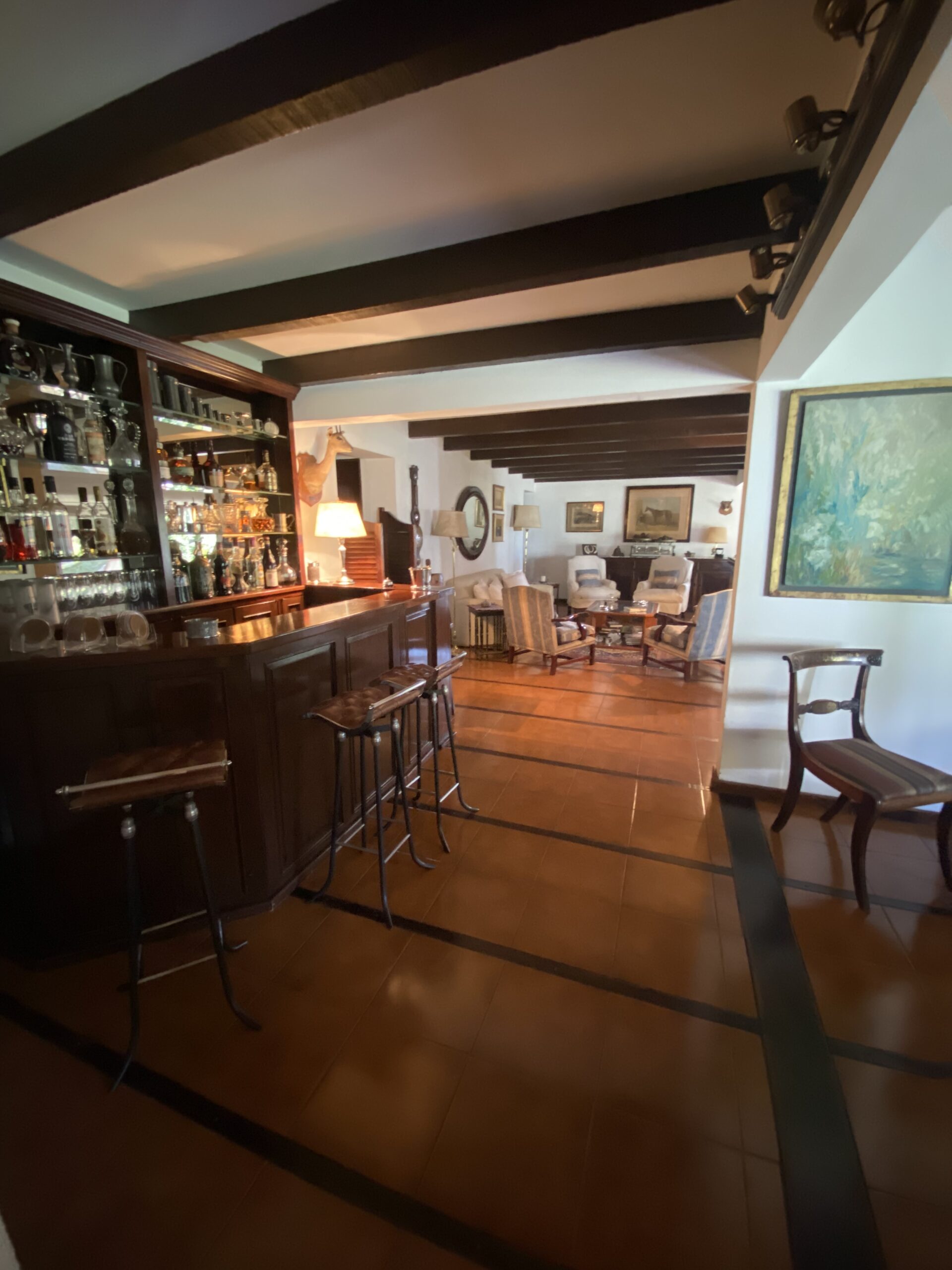 Posee una casa principal en la que en planta baja se encuentra un amplio living-comedor con bar y hogar, cocina-comedor diario, cuatro dormitorios todos en suite, toilette y escritorio . En planta alta suite principal con vestidor y hogar, balcón aterrazado.